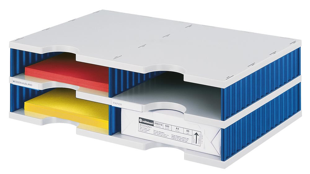· Zur Verwahrung von Kopierpapier, Zeitschriften, etc. oder als Postsortieranlage · Durch Aufbaumodule jederzeit erweiter- und kombinierbar · Aus hochbelastbarem Polystyrol · Boden in grau, Seitenteile farblich abgesetzt · Inkl. Beschriftungsschilder · Anlieferung erfolgt zerlegt im handlichen Karton