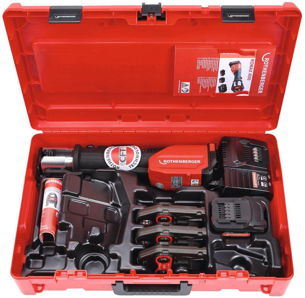 Akku-Pressmaschine ROMAX 4000 Basic Set CAS Akku, Ladegerät, SV 15, 22, 28 mm 4 Ah 32 - 34 kN 12 - 110 mm E6001952