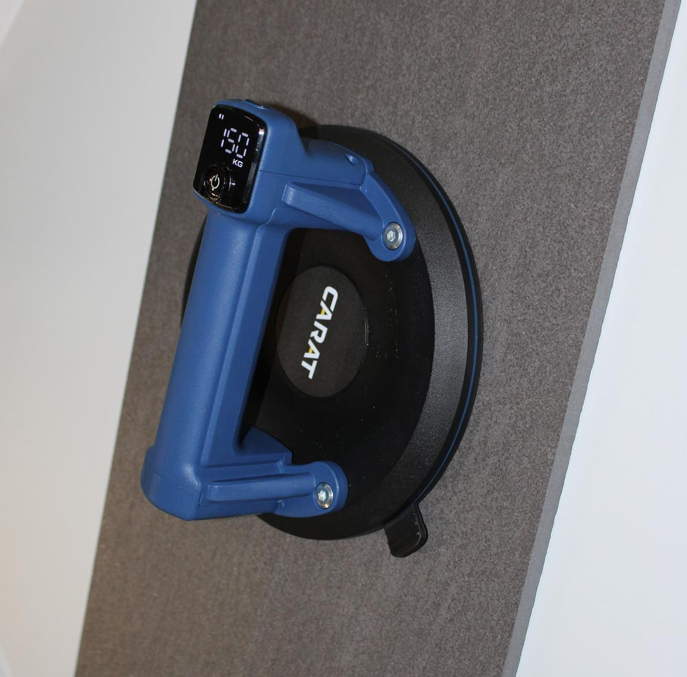 Digitaler Plattenheber mit integrierten Li-Ion-Akku (2,0 Ah) ∙ Zum Anheben von nicht porösen Materialien wie Fliesen, Marmor, Granit und Glas ∙ Saugt automatisch bis zu 200 kg Tragfähigkeit an und stoppt dann automatisch ∙ Vakuumpumpe schaltet sich automatisch wieder ein, wenn der Druck auf 130 kg absinkt ∙ Horizontal und vertikal einsetzbar ∙ Digitale Anzeige zeigt die momentan zu hebende Last (kg) an und den Batteriestatus