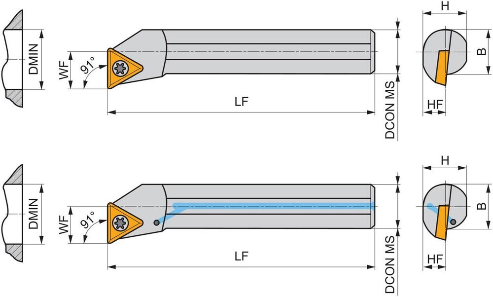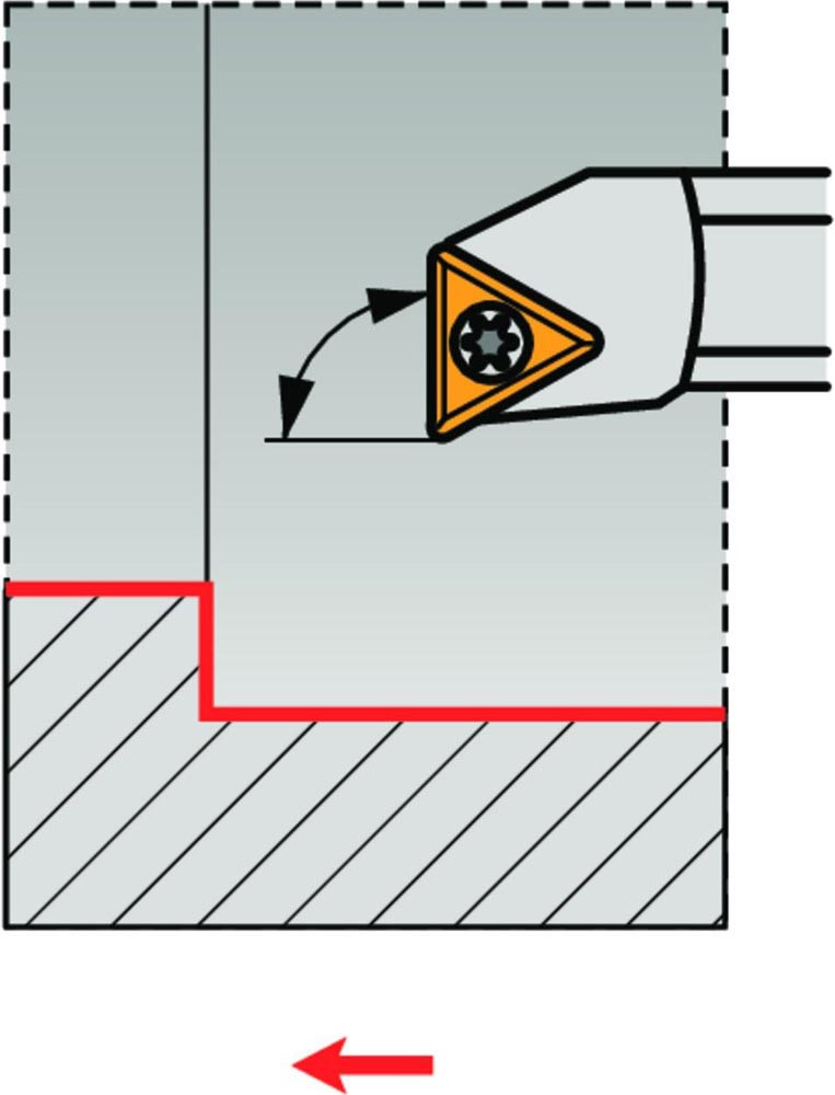 Dreh-Bohrstange mit Schraubklemmung zum spannen von Triangular positive Wendeschneidplatten mit einem Innenkreisdurchmesser von 3.97mm · 1.98mm Dick (ISO Bezeichnung TC.. 06T1.. ) · linke Ausführung zum 90° Längsdrehen mit abgesetzem Schaft · Stahl mit Kühlkanalbohrung · 6mm Durchmesser x 80mm Länge für Innenkegeldrehen und Längsdrehen mit und ohne Schulter