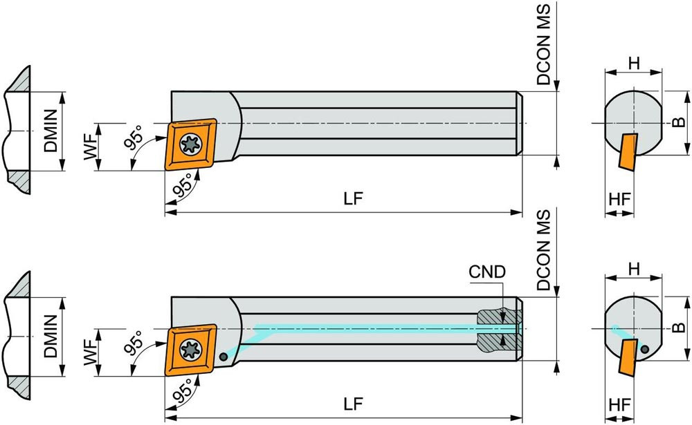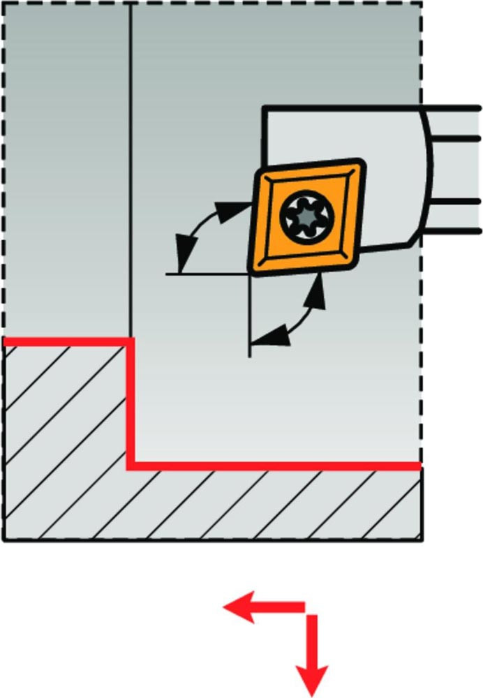 Dreh-Bohrstange mit Schraubklemmung zum spannen von 80° Rhombus positive Wendeschneidplatten mit einem Innenkreisdurchmesser von 7.94mm · 3.18mm Dick (ISO Bezeichnung CC.. 0803.. ) · linke Ausführung zum 95° Stirn-und Längsdrehen mit abgesetzem Schaft · Stahl mit Kühlkanalbohrung · 12mm Durchmesser x 150mm Länge für Innenkegeldrehen und Längsdrehen mit und ohne Schulter