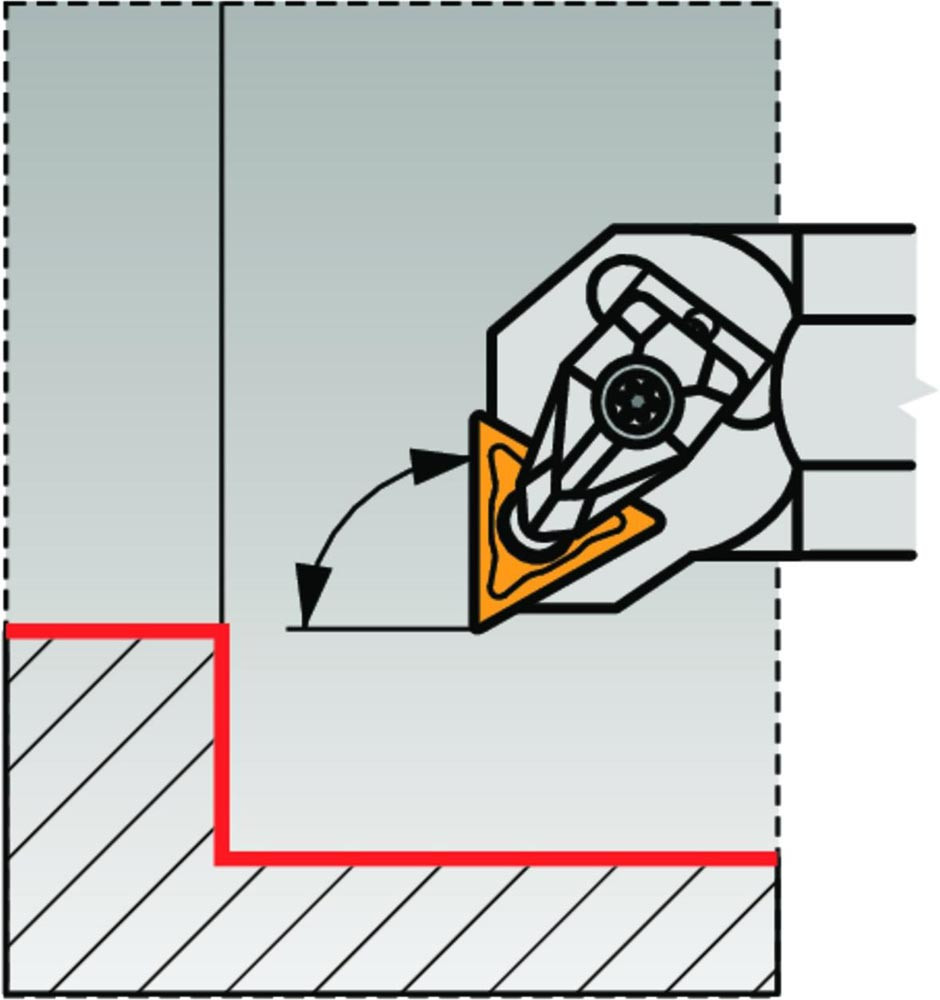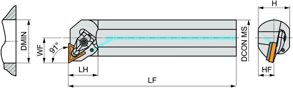 Dreh-Bohrstange doppelt geklemmt zum spannen von Triangular negative Wendeschneidplatten mit einem Innenkreisdurchmesser von 9.525mm · 4.76mm Dick (ISO Bezeichnung TN.. 1604.. ) · linke Ausführung zum 90° Längsdrehen mit abgesetzem Schaft · Stahl mit Kühlkanalbohrung · 32mm Durchmesser x 300mm Länge für Innenentgraten · Innenkegeldrehen und Längsdrehen ohne Schulter