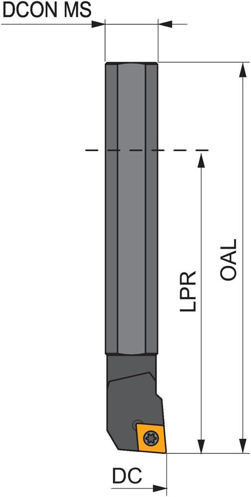 Schraubgeklemmte Bohrstange zum halten von 80° rhombische Form positive Wendeschneidplatte mit einem Innenkreisdurchmesser 6.35mm · 2.38mm Dick (ISO Bezeichnung CC.. 0602.. ) · rechte Ausführung 95° Seiten-und Stirnschnitt mit versetztem Schaft · Stahl ohne Kühlmittelbohrung · 12mm Durchmesser 64mm Überstandslänge für Kegel-und Längsbohren mit und ohne Schulter