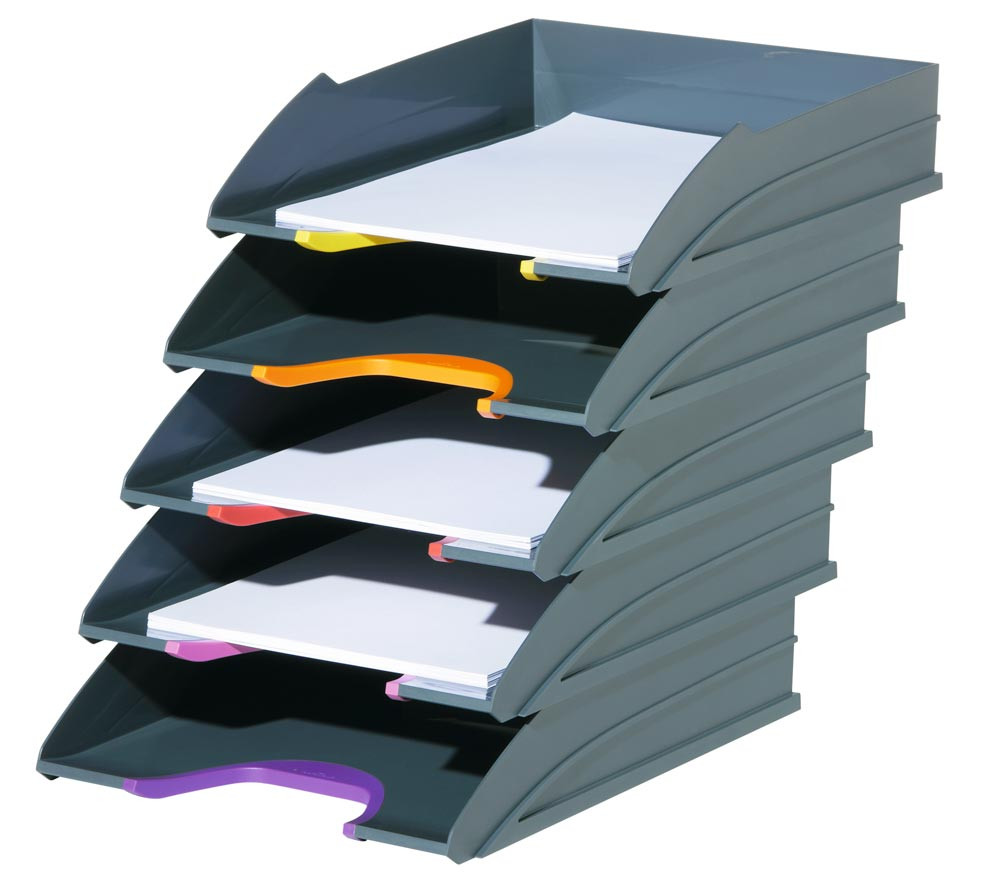 Briefablageschalen, grau/anthrazit mit verschiedenfarbigen Greifzonen, stapelbar, VE 5 Stück