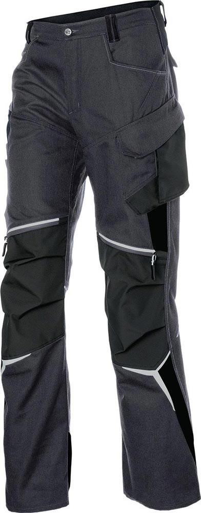 65% Polyester, 35% Baumwolle, ca. 260 g/m² · ergonomische Linienführung für mehr Bewegungsfreiheit · 2 Seitentaschen mit großem Eingriff · 2 Gesäßtaschen mit Patte und Klette · rechts: ergonomisch positionierte, lose, doppelte Meterstabtasche mit CORDURA®-Verstärkung und aufgesetzter Stifttasche · von oben befüllbare Knieschutztaschen aus CORDURA® mit Reißverschluss und nach innen gedrehter Spirale sowie Zippergarage gegen Schmutz und Verkratzen · vorgeformtes Knie mit Bewegungszone für ergonomisches Arbeiten in kniender Haltung · innovative Gewebebindung für extreme Robustheit und besondere Optik