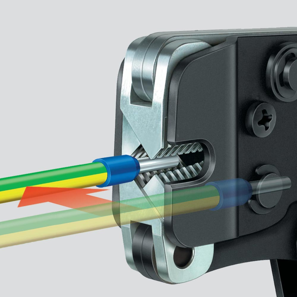 selbsteinstellend · für Aderendhülsen · mit Fronteinführung · zum Verpressen von Aderendhülsen nach DIN 46228 (Teil 1 + 4) · Vierkantcrimpung für stets optimale Kontaktflächen ungeachtet der Positionierung im Klemmanschluss · handliche und leichte Ausführung · ermüdungsarmes Arbeiten durch hohe Übersetzung · Chrom-Vanadin-Elektrostahl in Sondergüte, ölgehärtet
