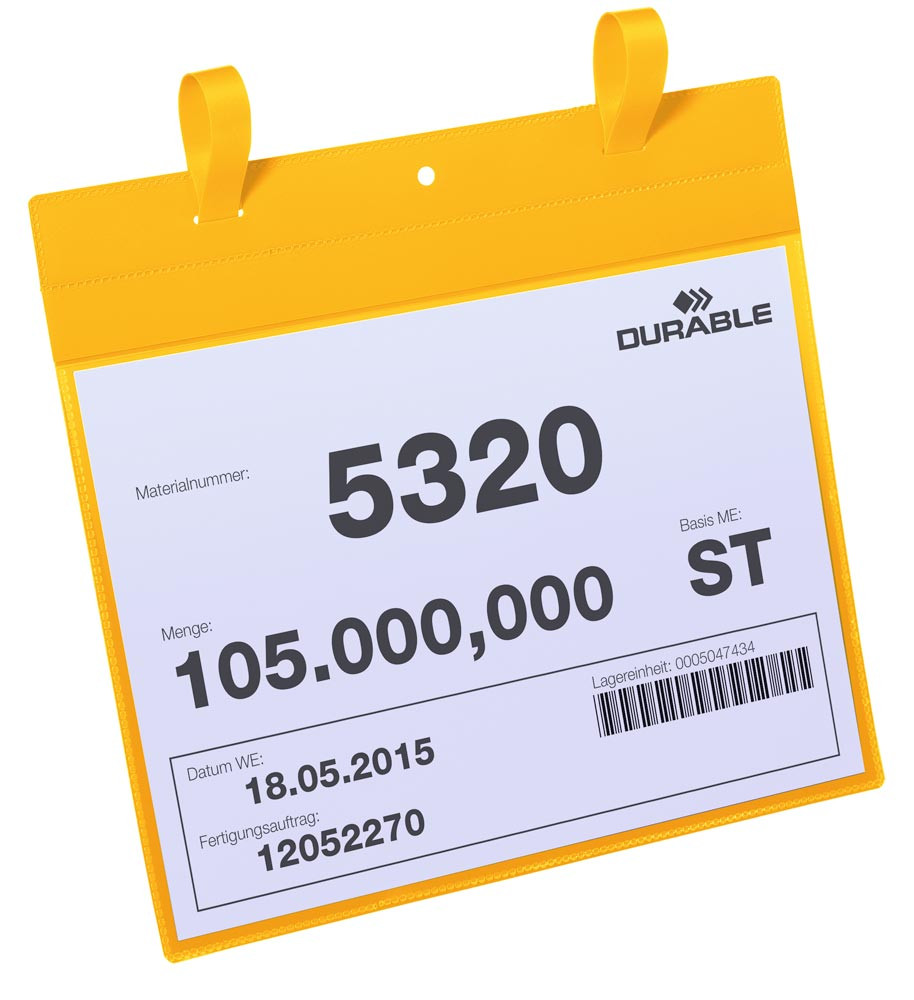 · Mit pfeilförmigen Laschen zur Befestigung an Lager- und Transportboxen · Starker Halt an beweglichen Transportbehältern wie Gitterboxen · Farbige Rückenfolie und transparente Vorderfolie aus strapzierfähigem Polypropylen · Scannertauglich und dokumentenecht · Geeignet für den Außeneinsatz durch Staub- und Regenschutzklappe · Schneller Austausch der Einsteckschilder · Dokumentenwechsel ohne Entfernen der Tasche · VE 50 Stück