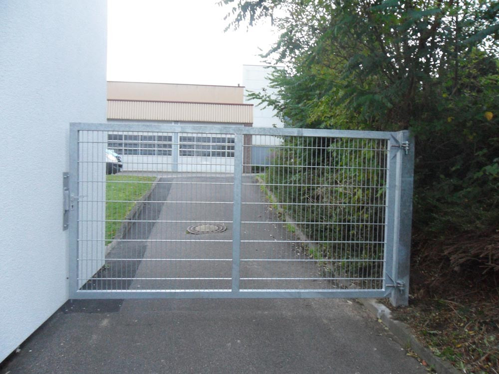 Drehflügeltor 1-flügelig, Drückergarnitur, Gitterfüllung 50x200 mm, Rahmen 40x40 mm, Pfosten 60x60 mm, BxH 1000x1600 mm, feuerverzinkt