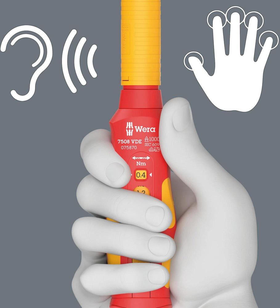 VDE-isolierter Drehmomentschraubendrehergriff mit 9 mm Sechskantaufnahme · ausschließlich für Wera Kraftform Kompakt VDE Wechselklingen · für professionelles Schrauben/Feinjustage UND für drehmomentkontrolliertes Schrauben · überrutschende, nicht überziehbare Drehmomentfunktion für Rechts-/ Linksanzug · mit fünf wählbaren Anzugsdrehmomenten Rechts/Links (Art.-Nr. 6500994: 0,4 · 0,8 · 1,2 · 1,6 · 2,0 Nm bzw. Art.-Nr. 6500995: 2,4 · 2,8 · 3,2 · 3,6 · 4,0 Nm), die extrem schnell eingestellt werden können · eine Fest-Stellung (Torque Lock) für unbegrenzte Löse-/Anzugsmomente · mit Freilaufhülse für eine gute Führung des Werkzeugs während des Schraubvorgangs