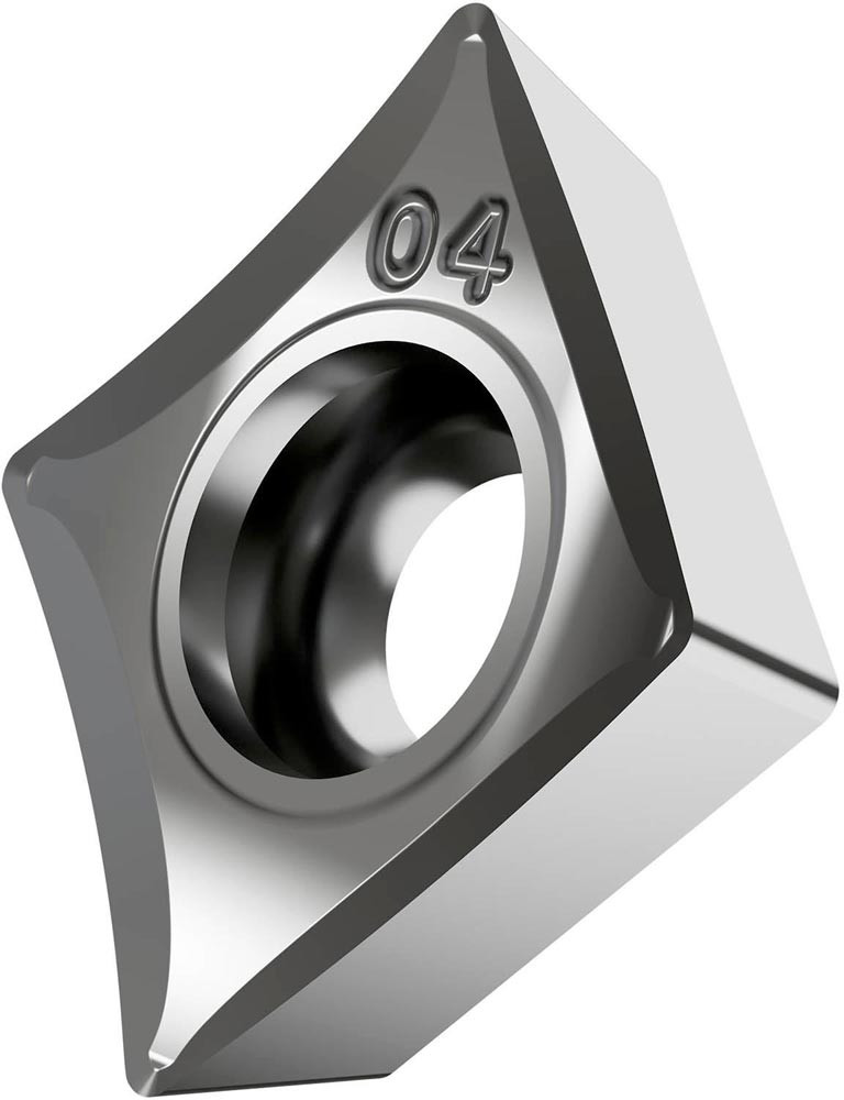 Einseitige positive Drehwendeschneidplatte · 80° Rhombisch mit 7° Freiwinkel · Innenkreisdurchmesser von 9.525mm · 3.97mm Dick · 0.8mm Radius · Indexgenauigkeit nach ISO-Toleranzklasse-G · Spanbrecher AL mit scharfer Schneidkante · im Substrat HF7 · unbeschichtet WC-Co Feinkornsubstrat im ISO-Bereich N10 -N25 · zum schlichten bis schruppen bearbeiten von Nichteisenmetallen