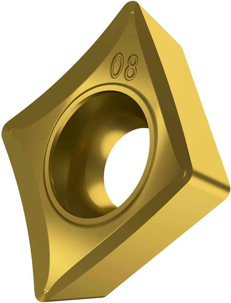 Einseitige positive Drehwendeschneidplatte · 80° Rhombisch mit 7° Freiwinkel · Innenkreisdurchmesser von 12.7mm · 4.76mm Dick · 0.8mm Radius · Indexgenauigkeit nach ISO-Toleranzklasse-G · Spanbrecher SF3 mit verrundeter Schneidkante · im Substrat T8315 · PVD beschichtet WC-Co Feinkornsubstrat in den ISO-Bereichen M05 -M20 und N05 -N25 · zum schlichten bis medium bearbeiten von nichtrostenden Stählen und Nichteisenmetallen