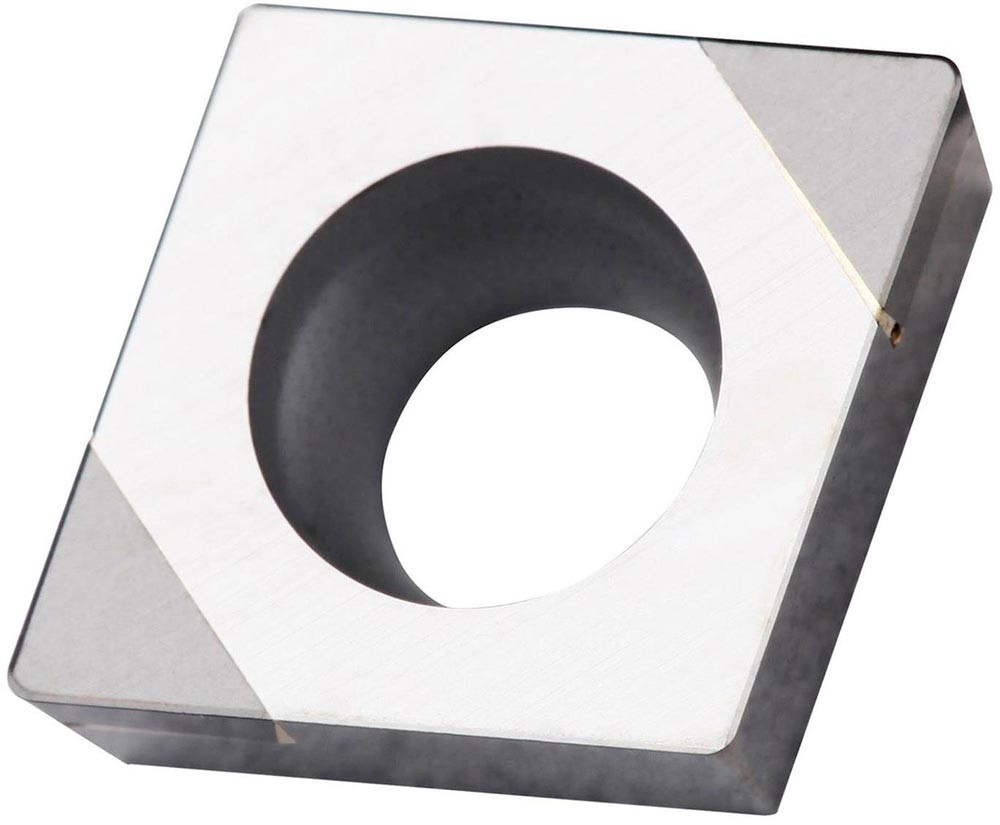 Wendeschneidplatte zum Hartdrehen mit 2 einseitig gekippten CBN-Ecken · 80° Rhomboid mit 7° Freiwinkel · Innenkreisdurchmesser 9.525mm · 3.97mm Dick · 0.4mm Schneidenradius · Wiederholgenauigkeit nach ISO-Toleranzklasse G · verrundeter und facettierter Schneidkante T-land -20°/0.1mm · im Substrat TB310 · unbeschichtetes CBN im ISO-Bereich H01-H10 · zur Hochvorschub Bearbeitung von gehärtetem Stahl