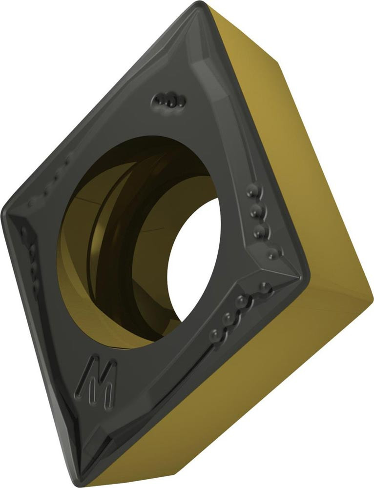 Einseitige positive Drehwendeschneidplatte · 80° Rhombisch mit 7° Freiwinkel · Innenkreisdurchmesser von 9.525mm · 3.97mm Dick · 0.4mm Radius · Indexgenauigkeit nach ISO-Toleranzklasse-M · Spanbrecher FM mit Wiper-Geometrie · im Substrat T9415 · MT-CVD beschichtet WC-Co Substrat im ISO-Bereich P05 -P30 · zum schlichten bis medium bearbeiten von Stählen