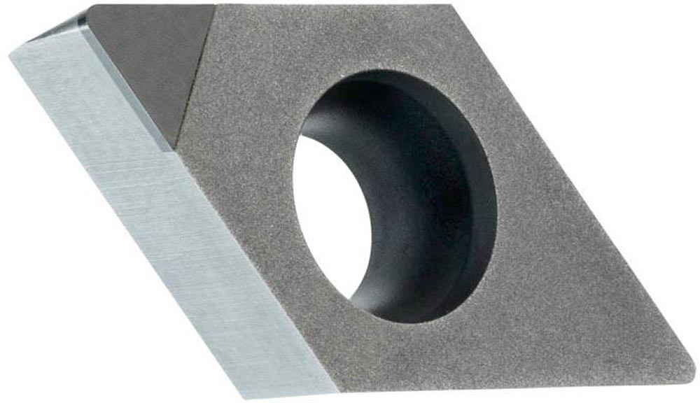 Wendeschneidplatte zum Drehen mit PKD Einsatz · 55° Rhomboid mit 7° Freiwinkel und Innenkreisdurchmesser 9.525mm · 3.97mm Dick · 0.8mm Schneidenradius · Wiederholgenauigkeit nach ISO-Toleranzklasse M · scharfer Schneidkante · im Substrat PD1 · unbeschichtetes PDK im ISO-Bereich N05-N25 · zur Hochvorschub Bearbeitung von Nichteisenmetallen