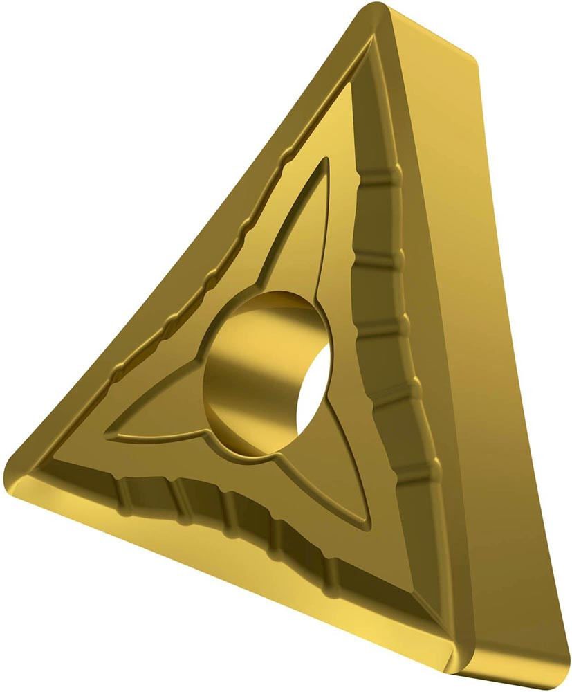 Doppelseitige negative Drehwendeschneidplatte · Triangular mit Innenkreisdurchmesser von 9.525mm · 4.76mm Dick · 0.8mm Radius · Indexgenauigkeit nach ISO-Toleranzklasse-M · Spanbrecher SF mit verrundeter Schneidkante · im Substrat T8315 · PVD beschichtet WC-Co Feinkornsubstrat in den ISO-Bereichen M05 -M20/K05 -K25 und H05 -H15 · zum schlichten bis medium bearbeiten von nichtrostenden Stählen · Gusseisen und gehärtetem Material