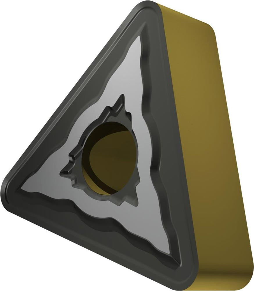 Doppelseitige negative Drehwendeschneidplatte · Triangular mit Innenkreisdurchmesser von 9.525mm · 4.76mm Dick · 1.2mm Radius · Indexgenauigkeit nach ISO-Toleranzklasse-M · Spanbrecher NMR mit verrundeter Schneidkante · im Substrat T9415 · MT-CVD beschichtet WC-Co Substrat im ISO-Bereich P05 -P30 · zum schlichten bis schruppen bearbeiten von Stählen