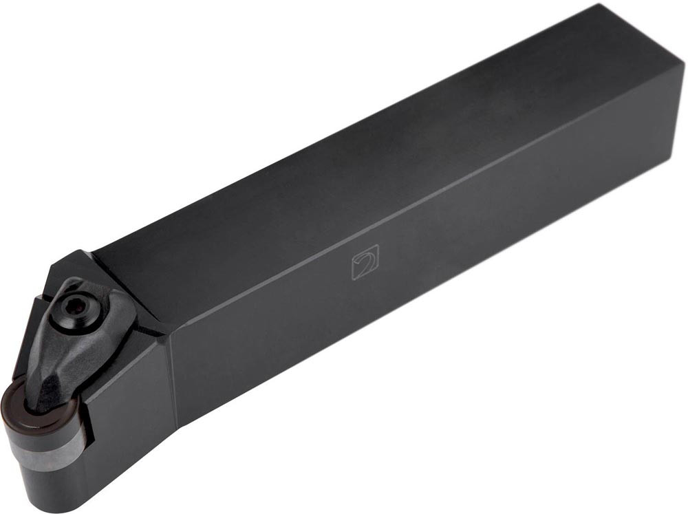 Dreh-Trägerwerkzeug doppelt geklemmt zum spannen von Rund negative Wendeschneidplatten mit einem Durchmesser von 12.7mm · 4.76mm Dick (ISO Bezeichnung RN.. 120400 ) · rechte Ausführung zum Stirndrehen mit abgesetzem Schaft · 25mm Werkzeughöhe x 25mm Breite x 150mm Länge für Kegeldrehen · Stirndrehen ohne Schulter und Längsdrehen ohne Schulter