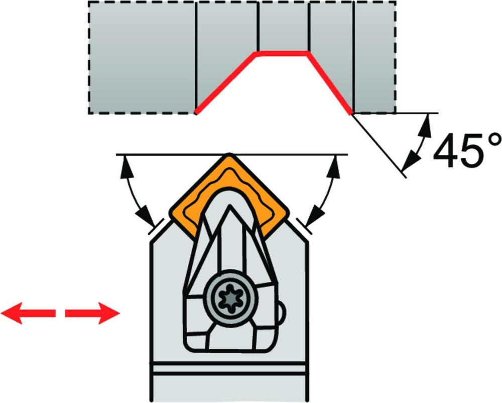 Dreh-Trägerwerkzeug doppelt geklemmt zum spannen von Viereckig negative Wendeschneidplatten mit einem Innenkreisdurchmesser von 12.7mm · 4.76mm Dick (ISO Bezeichnung SN.. 1204.. ) · neutrale Ausführung zum 45° Stirndrehen mit Zylinderschaft · 25mm Werkzeughöhe x 25mm Breite x 150mm Länge für entgraten · Kegeldrehen · Kopierdrehen in einer und mehreren Richtungen und Längsdrehen ohne Schulter