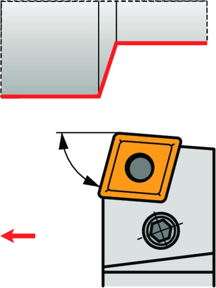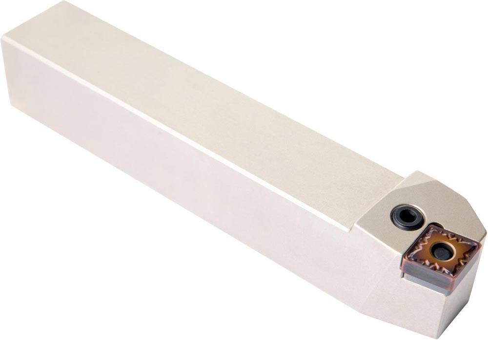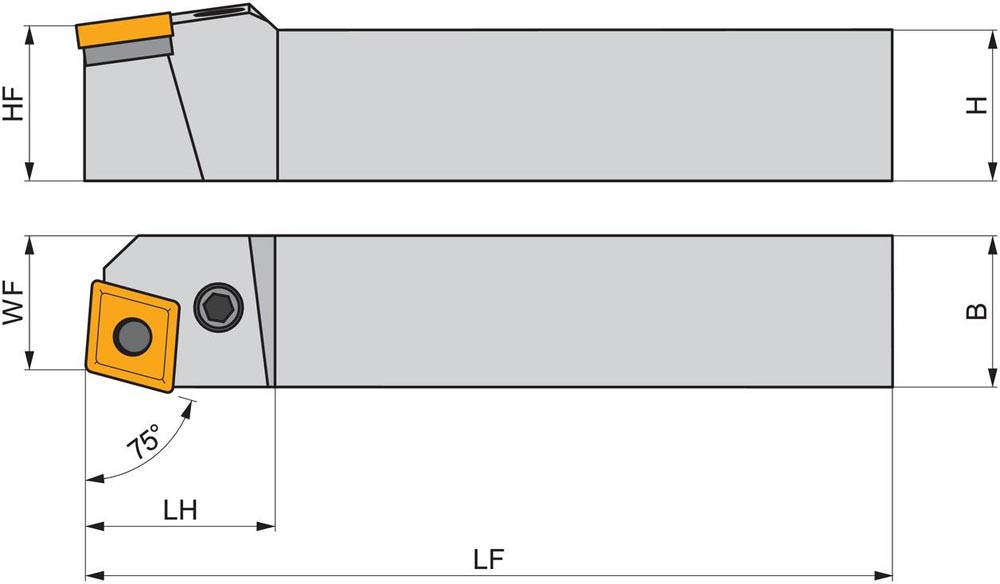 Dreh-Trägerwerkzeug mit Kniehebelklemmung zum spannen von 80° Rhombus negative Wendeschneidplatten mit einem Innenkreisdurchmesser von 19.05mm · 6.35mm Dick (ISO Bezeichnung CN.. 1906.. ) · linke Ausführung zum 75° Stirndrehen mit Zylinderschaft · 32mm Werkzeughöhe x 32mm Breite x 170mm Länge für Kegeldrehen und Längsdrehen ohne Schulter