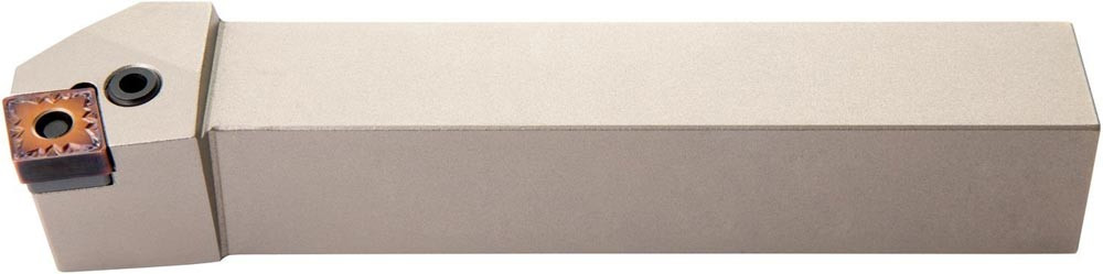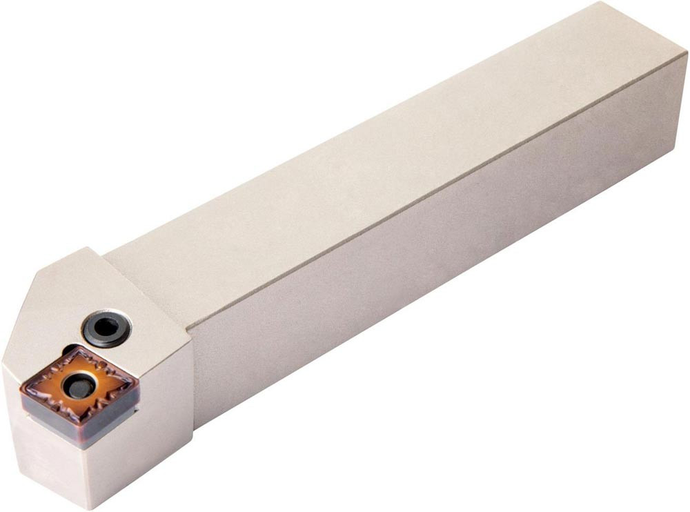 Dreh-Trägerwerkzeug mit Kniehebelklemmung zum spannen von 80° Rhombus negative Wendeschneidplatten mit einem Innenkreisdurchmesser von 12.7mm · 4.76mm Dick (ISO Bezeichnung CN.. 1204.. ) · rechte Ausführung zum 75° Längsdrehen mit abgesetzem Schaft · 25mm Werkzeughöhe x 25mm Breite x 150mm Länge für Stirndrehen ohne Schulter