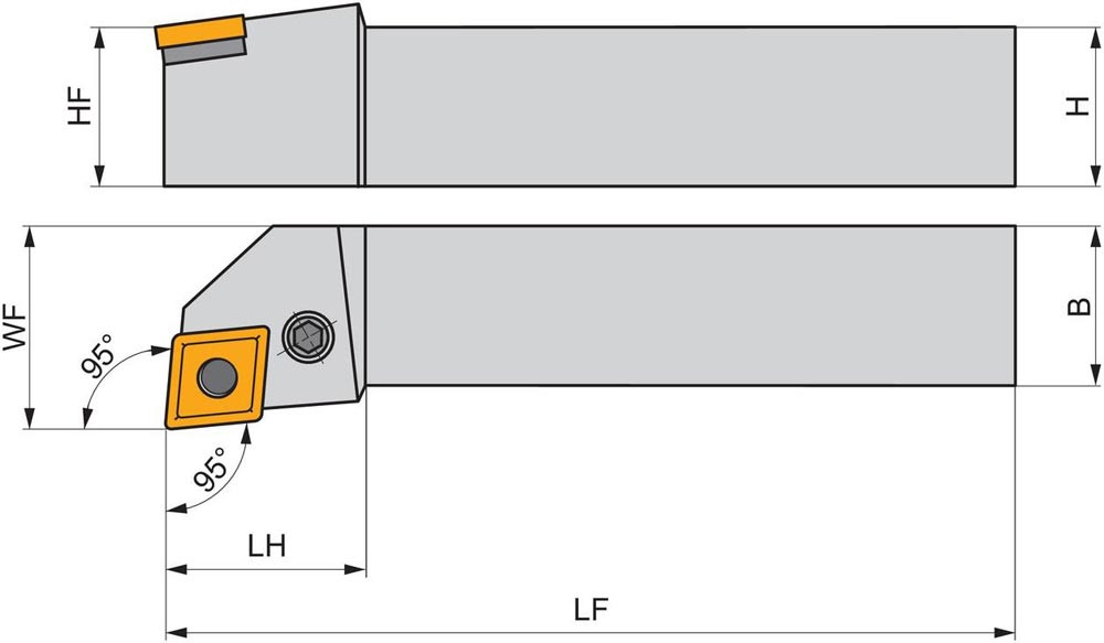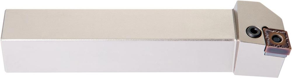 Dreh-Trägerwerkzeug mit Kniehebelklemmung zum spannen von 80° Rhombus negative Wendeschneidplatten mit einem Innenkreisdurchmesser von 25.4mm · 9.52mm Dick (ISO Bezeichnung CN.. 2509.. ) · linke Ausführung zum 95° Stirn-und Längsdrehen mit abgesetzem Schaft · 50mm Werkzeughöhe x 50mm Breite x 300mm Länge für Kegeldrehen · Stirndrehen mit und ohne Schulter und Längsdrehen mit und ohne Schulter