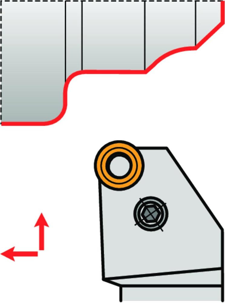 Dreh-Trägerwerkzeug mit Kniehebelklemmung zum spannen von Rund negative Wendeschneidplatten mit einem Durchmesser von 12.7mm · 4.76mm Dick (ISO Bezeichnung RN.. 120400 ) · rechte Ausführung zum Stirndrehen mit abgesetzem Schaft · 25mm Werkzeughöhe x 25mm Breite x 150mm Länge für Kegeldrehen · Stirndrehen ohne Schulter und Längsdrehen ohne Schulter