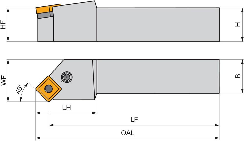 Dreh-Trägerwerkzeug mit Kniehebelklemmung zum spannen von Viereckig negative Wendeschneidplatten mit einem Innenkreisdurchmesser von 12.7mm · 4.76mm Dick (ISO Bezeichnung SN.. 1204.. ) · rechte Ausführung zum 45° Stirndrehen mit abgesetzem Schaft · 25mm Werkzeughöhe x 25mm Breite x 150mm Länge für entgraten · Kegeldrehen · Kopierdrehen in einer und mehreren Richtungen · Stirndrehen ohne Schulter und Längsdrehen ohne Schulter