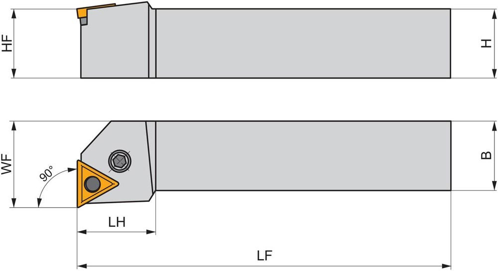 Dreh-Trägerwerkzeug mit Kniehebelklemmung zum spannen von Triangular negative Wendeschneidplatten mit einem Innenkreisdurchmesser von 15.875mm · 6.35mm Dick (ISO Bezeichnung TN.. 2706.. ) · linke Ausführung zum 90° Längsdrehen mit abgesetzem Schaft · 40mm Werkzeughöhe x 40mm Breite x 250mm Länge für Stirndrehen ohne Schulter