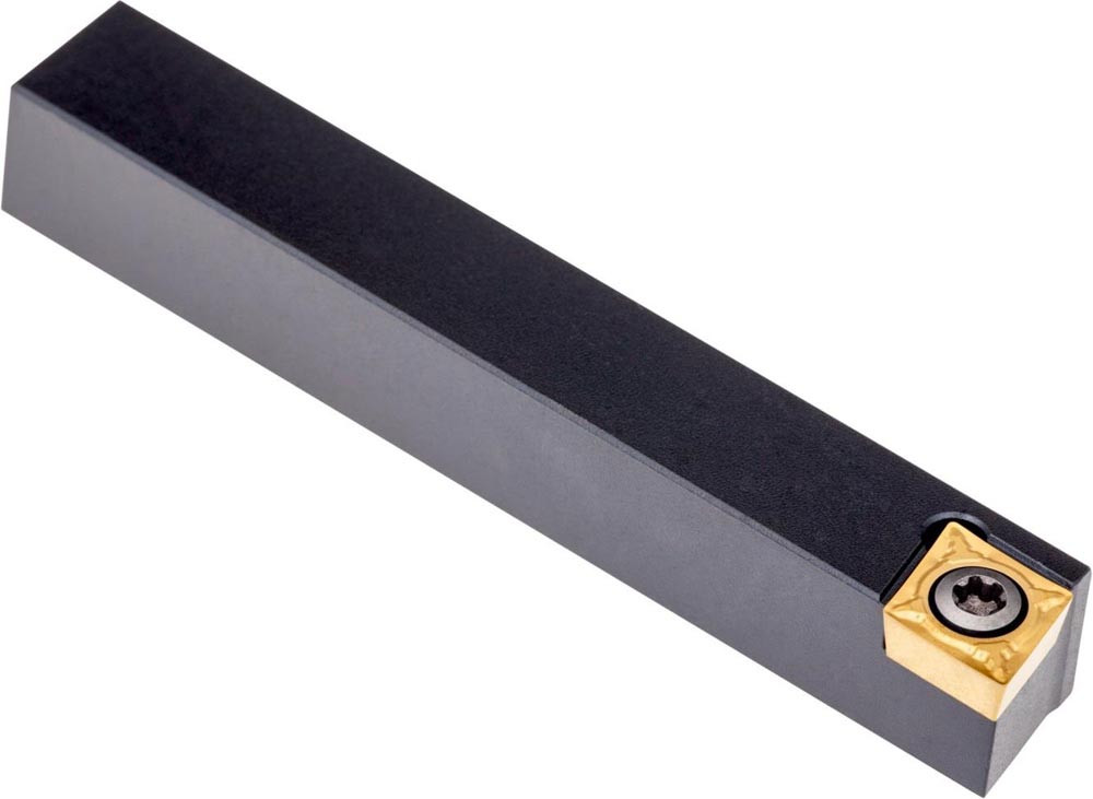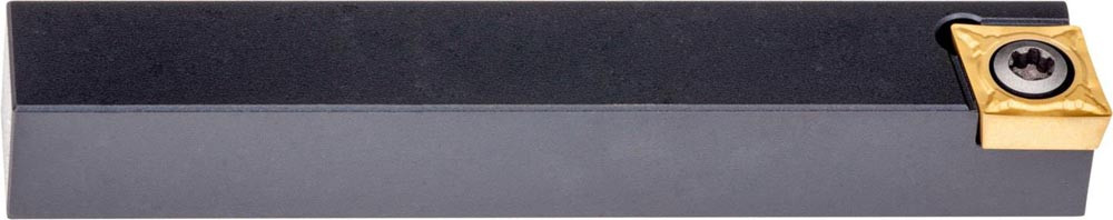 Dreh-Trägerwerkzeug mit Schraubklemmung zum spannen von 80° Rhombus positive Wendeschneidplatten mit einem Innenkreisdurchmesser von 9.525mm · 3.97mm Dick (ISO Bezeichnung CC.. 09T3.. ) · linke Ausführung zum 90° Stirndrehen mit Zylinderschaft · 16mm Werkzeughöhe x 16mm Breite x 100mm Länge für entgraten · Kegeldrehen und Längsdrehen mit und ohne Schulter