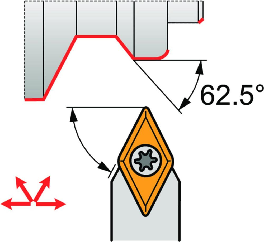 Dreh-Trägerwerkzeug mit Schraubklemmung zum spannen von 55° Rhombus positive Wendeschneidplatten mit einem Innenkreisdurchmesser von 6.35mm · 2.38mm Dick (ISO Bezeichnung DC.. 0702.. ) · neutrale Ausführung zum 62°30' Stirndrehen mit Zylinderschaft · 8mm Werkzeughöhe x 8mm Breite x 60mm Länge für entgraten · Kegeldrehen · Kopierdrehen in einer und mehreren Richtungen und Längsdrehen ohne Schulter