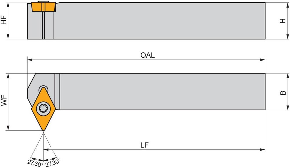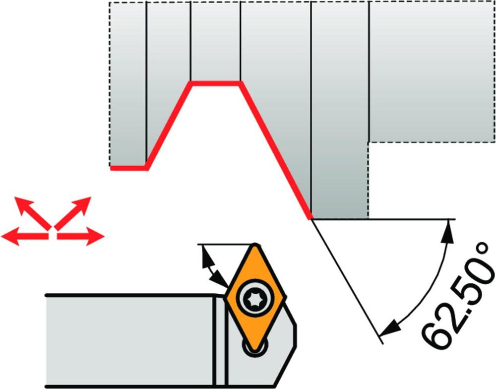 Drehmeißel mit Schraubklemmung · auch kompatibel für Langdrehautomaten zum spannen einer 55° Rhombisch positive Wendeschneidplatte mit einem Inkreisdurchmesser von 6.35mm · 2.38mm Dicke (ISO Bezeichnung DC.. 0702.. ) · linke Ausführung Sezielles Werkzeugdesign · 12mm Schaft Höhe x 12mm Breite x 125mm Länge zum Entgraten · Kegeldrehen · ein-und multidirektionales Kopierdrehen und Längsdrehen ohne Schulter