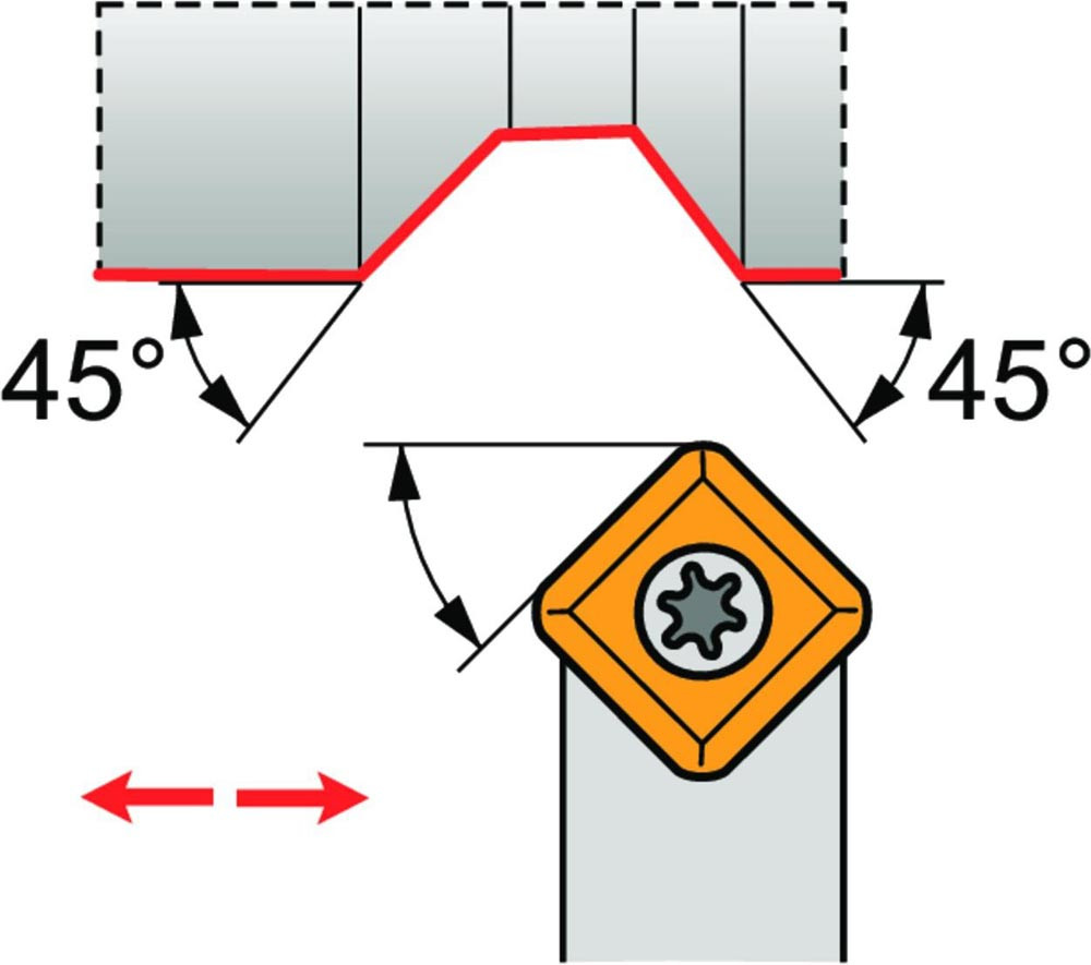Dreh-Trägerwerkzeug mit Schraubklemmung zum spannen von Viereckig positive Wendeschneidplatten mit einem Innenkreisdurchmesser von 12.7mm · 4.76mm Dick (ISO Bezeichnung SC.. 1204.. ) · neutrale Ausführung zum 45° Stirndrehen mit Zylinderschaft · 25mm Werkzeughöhe x 25mm Breite x 150mm Länge für entgraten · Kegeldrehen · Kopierdrehen in einer und mehreren Richtungen und Längsdrehen ohne Schulter