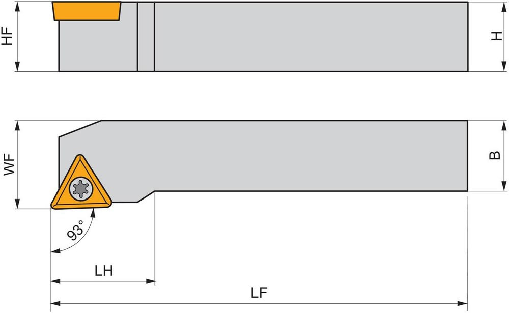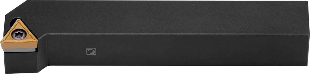 Dreh-Trägerwerkzeug mit Schraubklemmung zum spannen von Triangular positive Wendeschneidplatten mit einem Innenkreisdurchmesser von 9.525mm · 3.97mm Dick (ISO Bezeichnung TC.. 16T3.. ) · rechte Ausführung zum 93° Stirndrehen mit abgesetzem Schaft · 25mm Werkzeughöhe x 25mm Breite x 150mm Länge für Kegeldrehen und Längsdrehen mit und ohne Schulter
