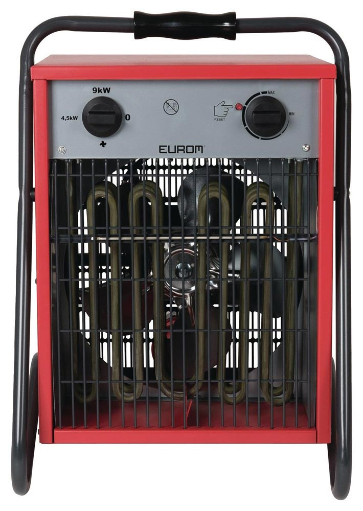elektrische 400-V-Heizlüfterheizung · für den Einsatz in Werkstätten, Schuppen und Garagen · 9000 Watt · mit Kaltluftventilator und Thermostat · spritzwassergeschützt · robustes Metallgehäuse · Überhitzungsschutz · mit Nachkühlfunktion