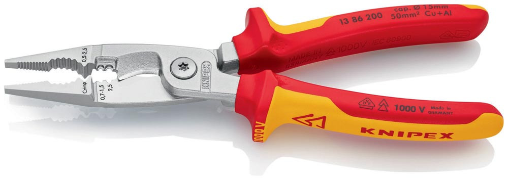 VDE-isoliert bis 1000 V · gefertigt gem. DIN EN/IEC 60900, stückgeprüft · für die Elektroinstallation · zum Greifen von Flach- und Rundmaterial, Biegen, Entgraten, Kabelschneiden, Abisolieren und Crimpen von Aderendhülsen · schlanke Bauform für gute Zugänglichkeit · Spezial-Werkzeugstahl in Sondergüte, geschmiedet, mehrstufig ölgehärtet