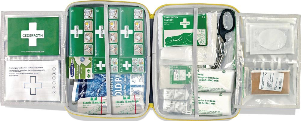 3 Cederroth 4-in-1 Blutstiller, 2 Cederroth 4-in-1 Mini-Blutstiller, 1 Heftpflaster Sensitive 5 m x 25 cm, 1 Kälte-Sofortkompresse, 2 Fixierbinde 8 cm x 4 m, 6 Kompresse 10 x 10 cm, 1 Verbandtuch 60 x 80 cm, 5 Vliesstoff-Tuch 20 x 30 cm, 2 Folienbeutel, 2 Paar Handschuhe, 1 Rettungsdecke, 2 Fixierbinde 6 cm x 4 m, 1 Schere, 2 Dreiecktuch, 2 Augenkompresse, 4 Handreinigertücher, 2 Gesichtsmasken, 42 Pflaster in gemischten Größen: 6 Pflaster 19 x 72 mm, 12 Pflaster 25 x 72 mm, 6 Fingerpflaster, 12 Pflaster 10 x 6 cm, 6 Fingerkuppenpflaster, 1 Erste-Hilfe-Broschüre, 1 Inhaltsverzeichnis