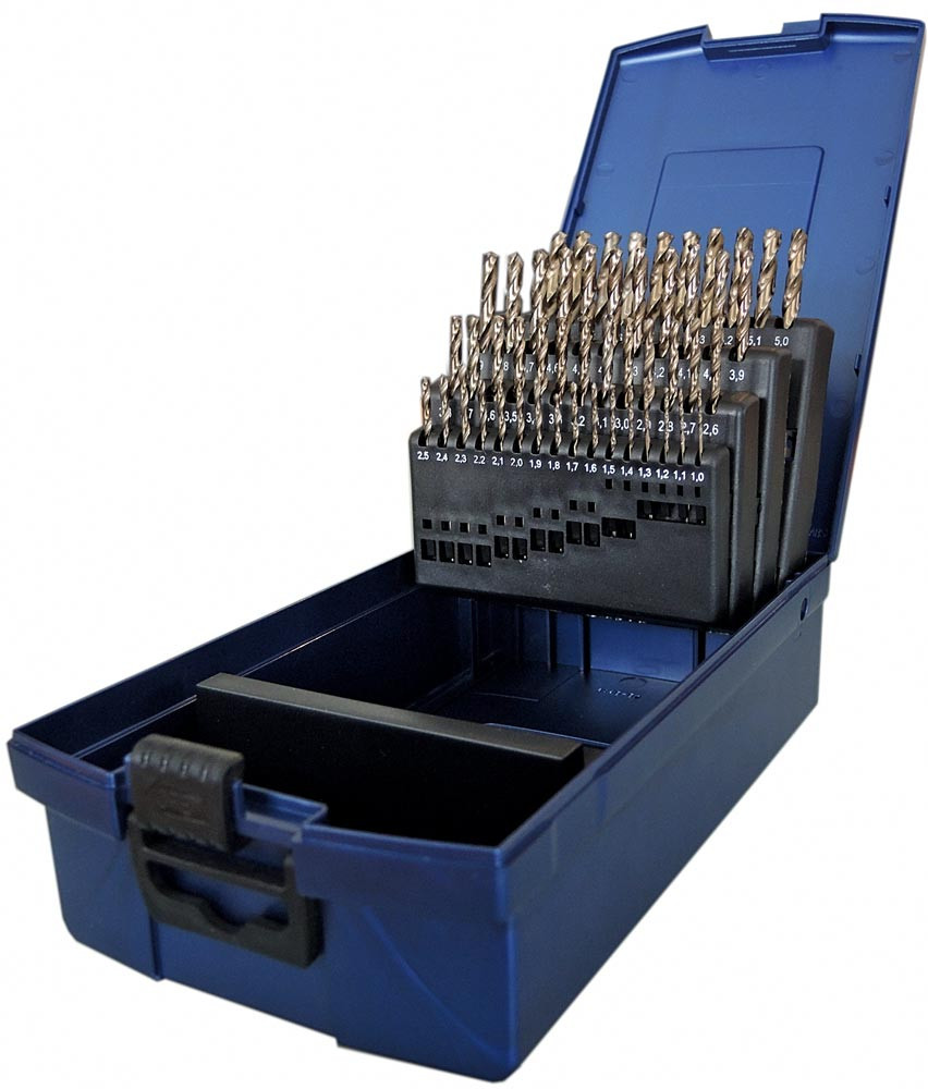 Ausführung: Mit Zylinderschaft, kurz, nach DIN 338 Typ N, rechtsschneidend ∙ Profilgeschliffener HSS-E/Co-Bohrer mit 5% Cobaltlegierung ∙ Hohe Rundlaufgenauigkeit, hohe Bruchsicherheit und lange Standzeit mit ausgeprägter Warmhärtebeständigkeit ∙ Gold-finish Ausführung ∙ Spitzenwinkel 130°, mit Kreuzschliff Form C ab Ø 2 mm - Ø-Toleranz h8 ∙ Übrige Konstruktionsmerkmale nach DIN 1414 ∙ Sätze in robuster Klappkassette aus ABS-Kunststoff