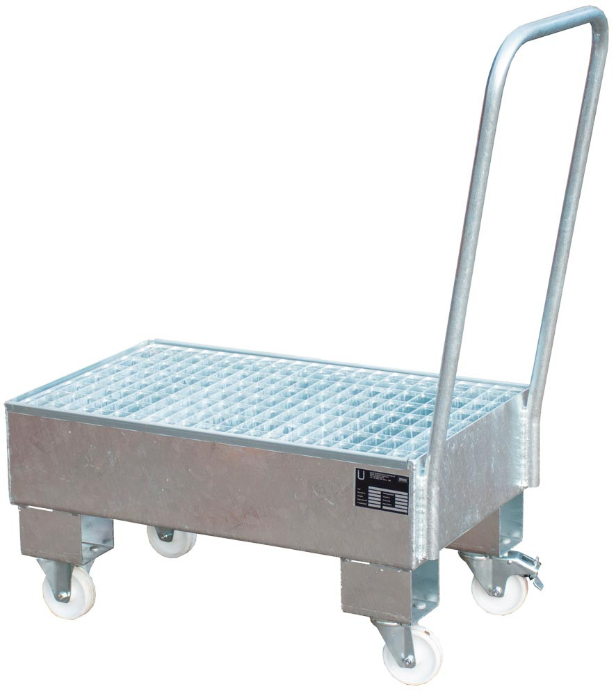 Fahrbare Auffangwanne für 2x60-l-Fass, 3 mm Stahlblech, stehend Lagern, BxTxH 940x500x1075 mm, Auffangvol. 61 l, verzinkt
