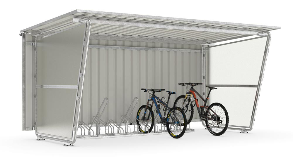 ∙ Praktisches Set mit langlebiger Pultdach-Konstruktion ∙ Mit pulverbeschichteter Rückwand aus Stahlblech, zwei durchscheinende Seitenwände sowie vier Anlehnparker ∙ Verzinktes Trapezblechdach ∙ Regenwasser wird frei nach hinten abgeleitet ∙ Modular erweiterbar ∙ Lieferung als Bausatz inkl. Fundament- und Montageplan