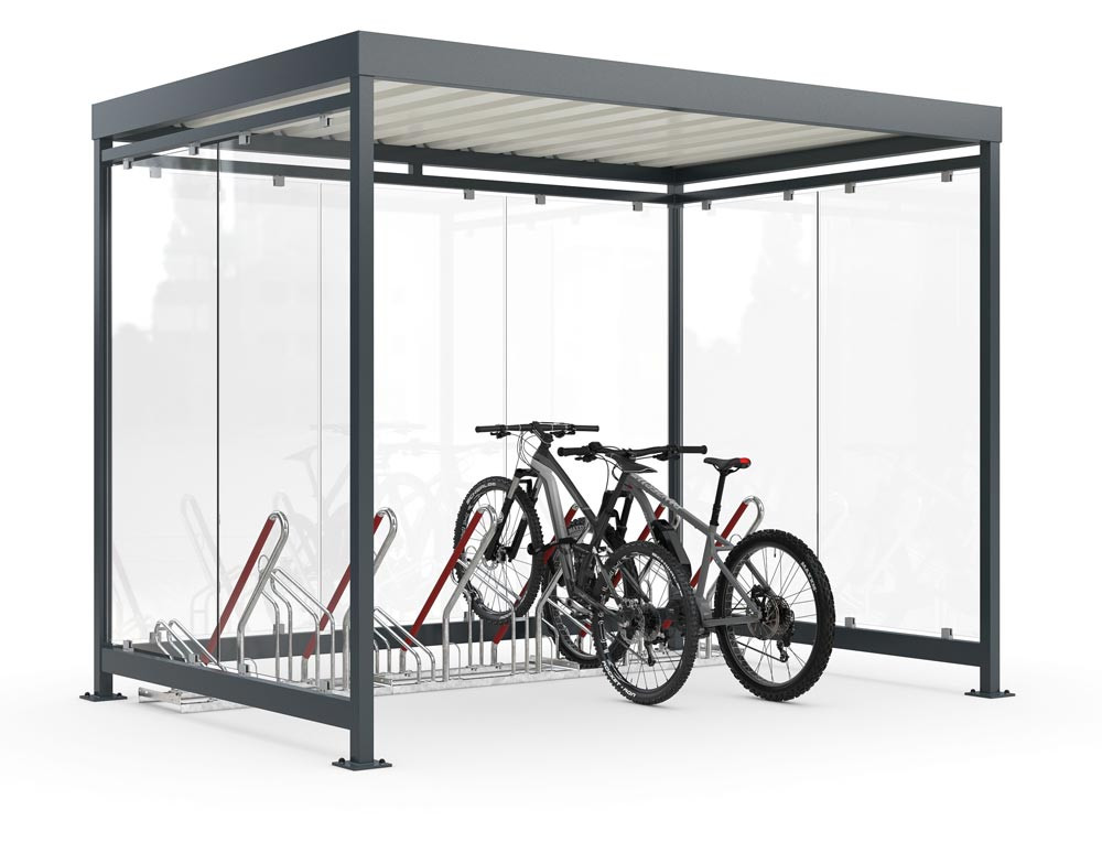 ∙ Feuerverzinkte Flachdach-Stahlkonstruktion inkl. komfortablem Anlehnsystem ∙ Schützt hochwertige Fahrräder vor Beschädigung und Diebstahl ∙ Einscheibensicherheitsglas mit Glashaltern ∙ Entwässerung erfolgt über bodenseitige Wasserspeier ∙ Für sehr hohe Wind- und Schneelasten geeignet ∙ Für Reifenbreiten bis 64 mm ∙ Inkl. Fahrradständer ∙ Ohne Überpflasterung