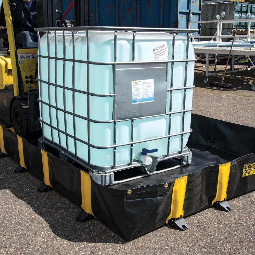∙ Langlebige, befahrbare Faltwanne für Fässer, IBC-Behälter und Tanks ∙ PVC beschichtetes Gewebe, zur Platzierung im von schweren Materialien im Arbeitsraum, gelegentliche Eion- und Ausfahrsituationen und Fußgängerverkehr ∙ Chemikalienbeständig und beständig gegen Langzeit-UV Belastung, ideal für den Außeneinsatz ∙ Wandhaltersystem aus Edelstahl ∙ Verriegelt sich bei 90° für eine sichere, dichte Eindämmung ∙ Schneller und einfacher Aufbau, keine Montage erforderlich