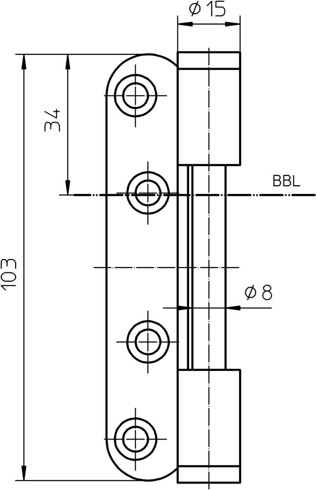 für mittlelschwere, gefälzte Türen bis 80 kg · Rollenlänge 103 mm · Rollen-Ø 15 mm · Stift-Ø 8 mm · wartungsfreie Gleitlagertechnik