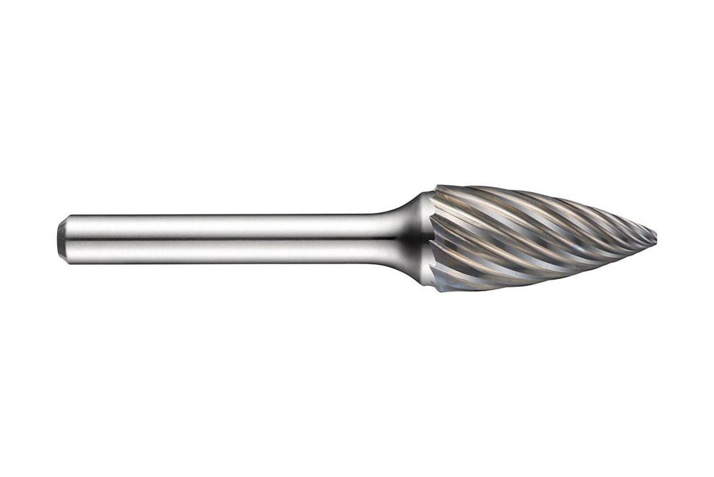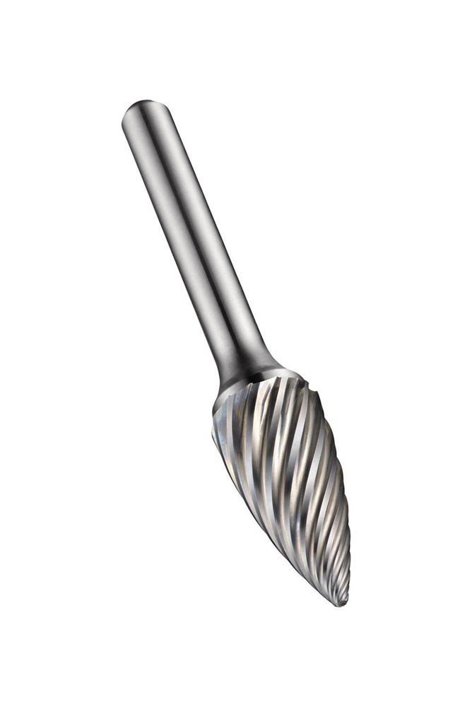 Spitzer Tannen-Frässtift (Form G) · Durchmesser 6mm mit 18mm Schnittlänge · 50mm Gesamtlänge und 6mm Schaft · Vollhartmetall mit blanker Oberfläche · VA einseitigem Schnitt mit mittlerer Zahnteilung zum bearbeiten von Konturen mit mehreren Winkel und Schneiden von engen Winkeln in schwer zugänglichen Bereichen in Edelstahl