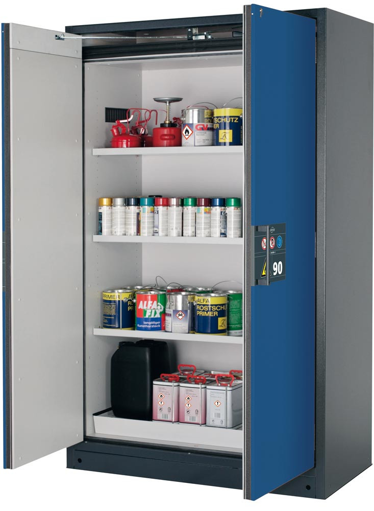 ∙ Extrem robuste Bauweise ∙ Kratzunempfindliche Strukturlackierung ∙ Mit einer Hand zwei Türen öffnen (AGT) ∙ Serienmäßige Tür-Schließ-Automatik (TSA) schließt nach ca. 60 Sekunden die arretierten Türen, optisches und akustisches Warnsignal vor Türschließung · Sicheres Arbeiten mit integrierter Türfeststellanlage ∙ Im Brandfall schliessen die Türen selbständig über den eingebauten Thermoauslöser ∙ Feuersicherheit 90 Minuten ∙ Manipulationssicheres Schloss mit Anzeige des momentanen Schließzustandes (Integration in Schließanlage möglich) ∙ Fest integrierter, unterfahbarer Sockel (Sockelblende optional erhältlich) ∙ Leichtes Umsetzen mit Gabelhubwagen möglich ∙ Standardkorpus RAL 7016 anthrazit