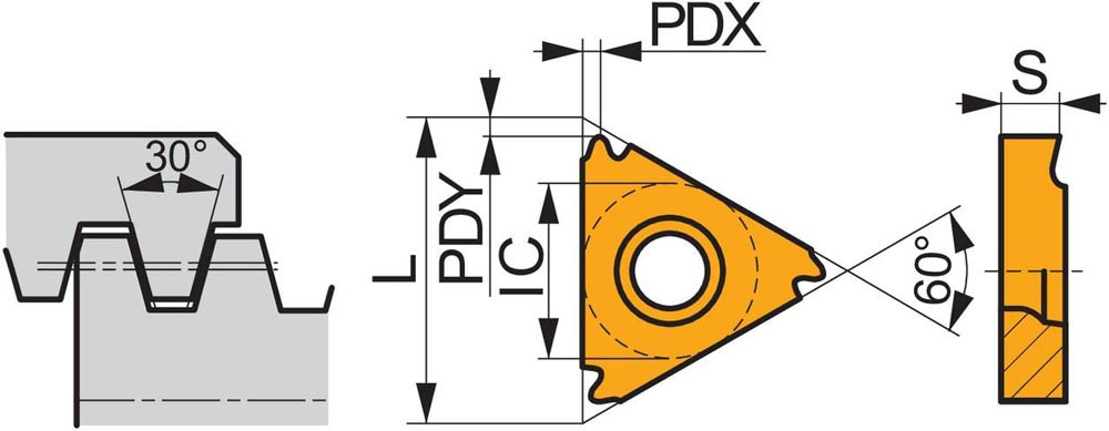 Einseitige Gewindedreh-Wendeschneidplatte · dreieckig mit einem Innenkreisdurchmesser von 12.7mm · für linksschneidende Werkzeuge für Trapezförmiges TR-Außengewinde mit 5mm Steigung · T8030 PVD beschichtet feinkörniges WC-Co-Hartmetall innerhalb der ISO-Substrats-Bereiche P25-P40/M20-M35 und K20-K40 zum zerspanen von Stahl · Edelstahl und Guss