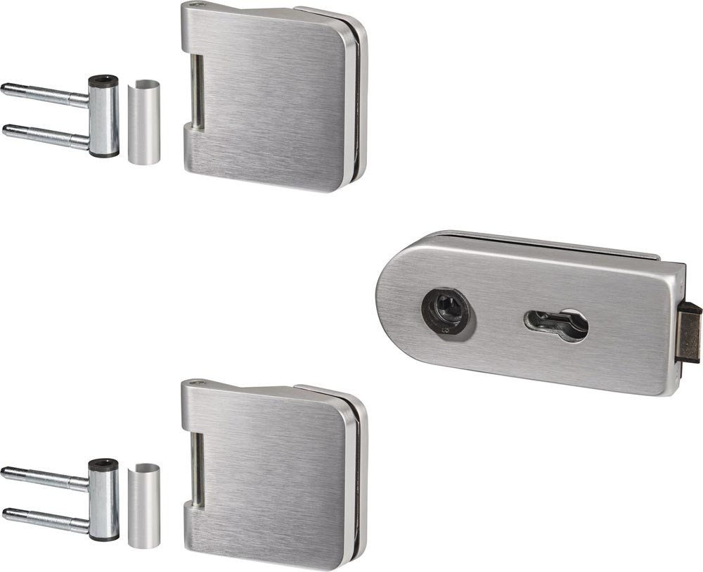 mit halbkreisförmigem Kappenende, zur Glasmitte zeigend · für 8 mm Glasdicke und 24 mm Falztiefe bzw. für 10 mm Glasdicke und 26 mm Falztiefe · DIN links / rechts verwenbar · Material Aluminium · für ESG 8 bzw. 10 mm · max. Türflügelgewicht: 60 kg / 80 kg (OFFICE Bänder) · Schlosskasten Abmessungen (BxHxT): 159x65x37 mm · Schloss nach DIN 18 251, Klasse 3 (200.000 Betätigungen der Fallenfunktion und 50.000 Betätigungen des Riegels, bei fest montiertem Beschlag nach DIN 18 257) · Einsatzbereich für 1-/2-flügelige Anlagen oder Anlagen mit Seitenteil · mit Drückerführung · ohne Drücker