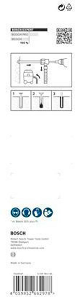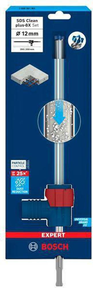 Bohren in Stahlbeton mit verbesserter Staubreduzierung! Durchdringt Stahlbeton mit einem Voll-Carbide-Kopf mit 4 Schneidern Das Bohren präziser Löcher in Beton ist nur ein Schritt bei der Installation chemischer Dübel. Der nächste Schritt besteht in zeitraubenden Reinigungsarbeiten. Mit dem EXPERT SDS Clean plus-8X wird alles anders. Das System bohrt Löcher und entfernt gleichzeitig Staub. Das beschleunigt und vereinfacht die Installation chemischer Dübel. Wir haben das EXPERT SDS Clean plus-8X Set für Bauarbeiter und Installateure entwickelt · die Löcher für chemische Dübel bohren müssen. Der Bohrer ist mit einem 4-Schneider-Vollhartmetallkopf und einem robusten Staubsaugerrohr ausgestattet. Zudem haben wir den SDS Clean plus Anschluss verbaut · der für alle SDS Clean plus-8X Bohrer geeignet ist und sich leicht montieren und abnehmen lässt. Du erhältst also einen leistungsstarken Bohrer · der bei Verstopfung leicht zu reinigen ist (einfach das Absaugrohr vom Bohrer abnehmen) sowie eine neue Technologie zur Staubreduzierung · mit der du Löcher für chemische Dübel schneller vorbereiten kannst. Zudem ist die Luft am Arbeitsplatz sauberer. Alles mit nur einem Zubehör. Hocheffizienter Abtransport von Staub mit Bosch Particle Control