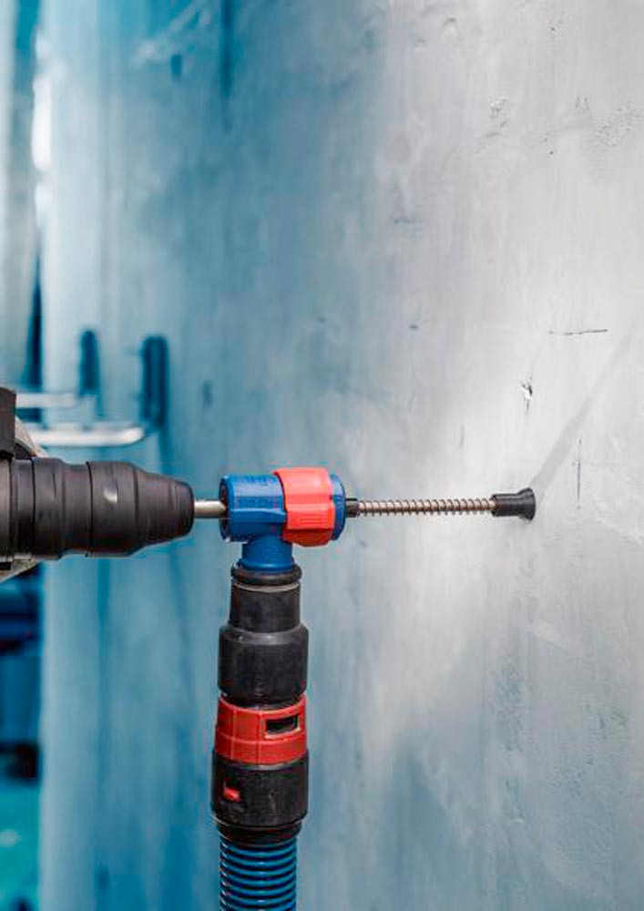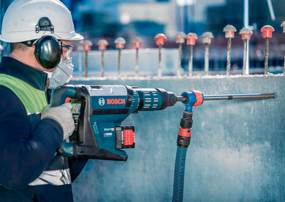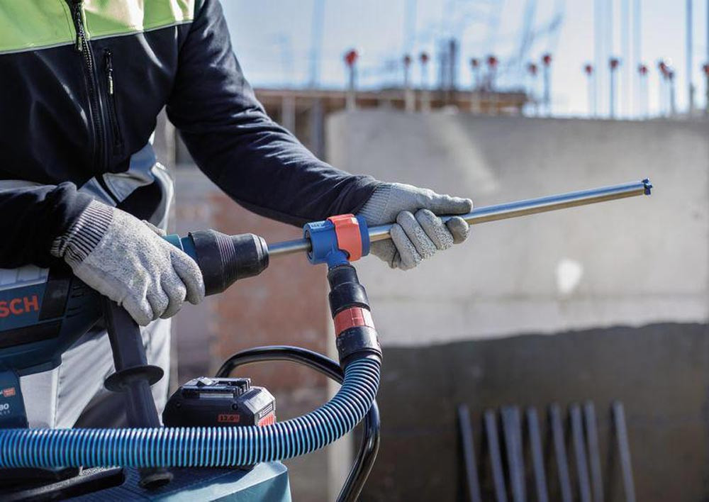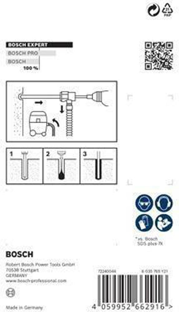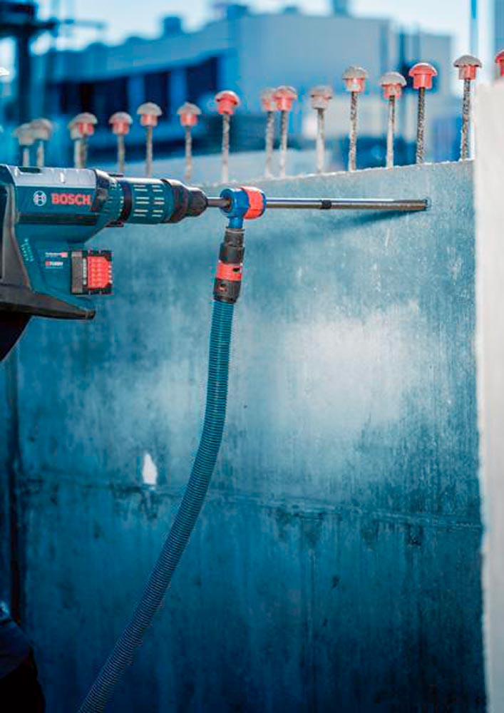 Bohren in Stahlbeton mit verbesserter Staubreduzierung! Durchdringt Stahlbeton mit einem Voll-Carbide-Kopf mit 4 Schneidern Installateure und Bauarbeiter wissen nur zu gut · dass beim Bohren in Beton große Mengen an Staub anfallen. Besonders unangenehm ist dies beim Bohren über Kopf oder beim Bohren und Reinigen für chemische oder mechanische Dübel. Für diese anspruchsvollen Arbeiten haben wir das EXPERT SDS Clean plus-8X Set entwickelt. Mit diesem Set bohrst und entfernst du gleichzeitig Staub und Bohrmehl · sodass mühsame Reinigungsarbeiten entfallen. Mit EXPERT SDS Clean plus-8X Set wird der Staub beseitigt · wenn du über Kopf oder eine ganze Reihe von Löchern für mechanische oder chemische Dübel bohren musst. Der Bohrer ist mit einem Vollhartmetallkopf mit 4 Schneiden und innenliegendem Absaugkanal ausgestattet. Zudem haben wir den SDS Clean plus Anschluss verbaut · der für alle SDS Clean plus-8X Bohrer geeignet ist und sich leicht montieren und abnehmen lässt. Er verbindet die Bohrmaschine mit Staubabsaugungen · sodass Staub und kleines Bohrgut durch den integrierten Absaugkanal aus dem Bohrloch extrahiert werden kann. Die vormontierte Staubkappe unterstützt das Auffangen von Schmutz und Staub · sobald du mit dem Bohren beginnst. Hocheffizienter Abtransport von Staub mit Bosch Particle Control