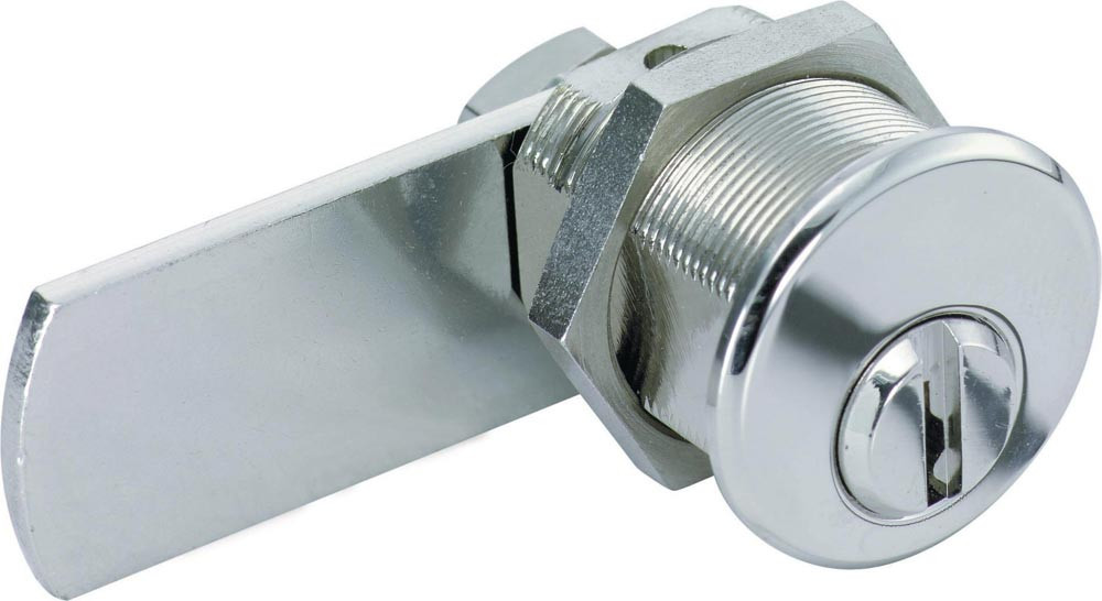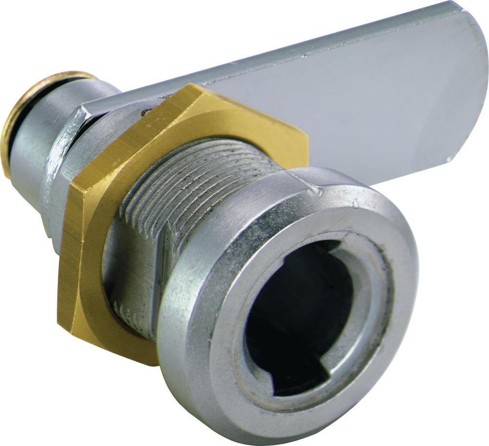 Stiftzylinder-Hebelschloss mit Schließzwang · Schließweg 1-4-6-7, · verschiedenschließend · Messing poliert vernickelt · ø 25 mm · mit Außengewinde · für Materialstärke 1-18 mm · 2 Schlüssel
