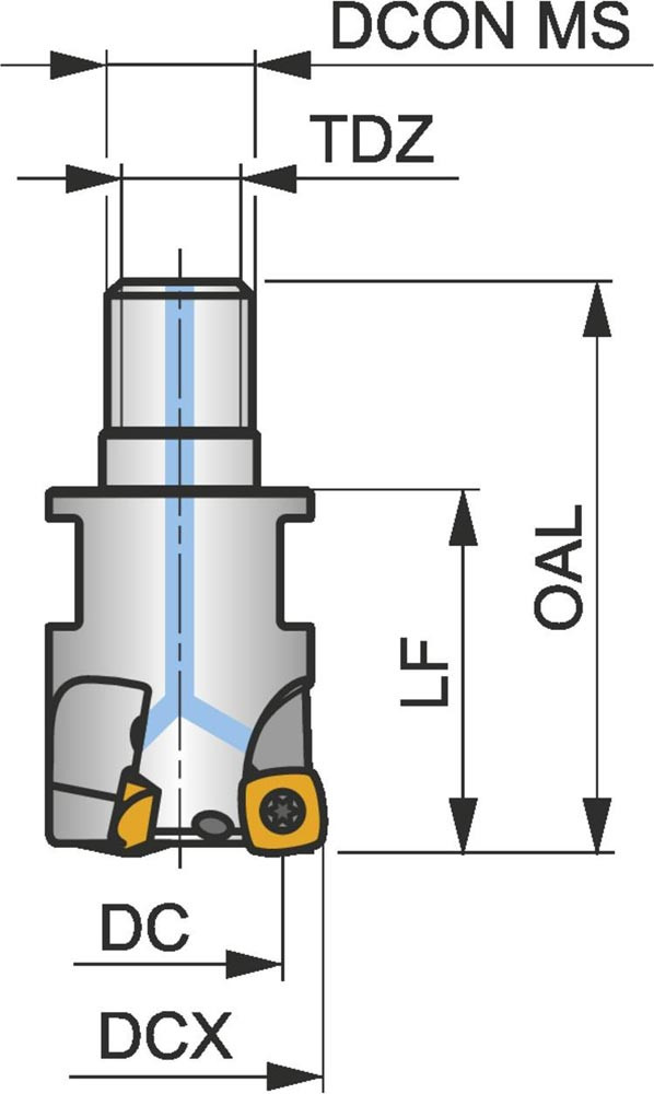 Hochvorschubfräser mit positiver/negativer Geometrie zum spannen von 3 Stück ZDEW 1204.. einseitigen Wendeschneidplatten · Schnittdurchmesser 32mm mit M16 Gewindeschaft für modulare Standardhalter · 40mm Überstandslänge · Kühlkanalbohrung zum Planfräsen